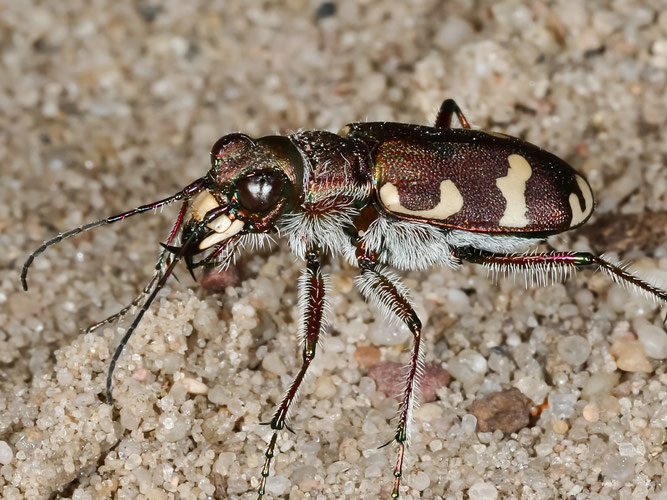 Dünen-Sandlaufkäfer (Cicindela hybrida) als typischen Beutegreifer, der sich von anderen Insekten ernährt. Er bewohnt offene bzw. halboffene sandige Biotope, wo er durch seine Größe kaum ins Auge
